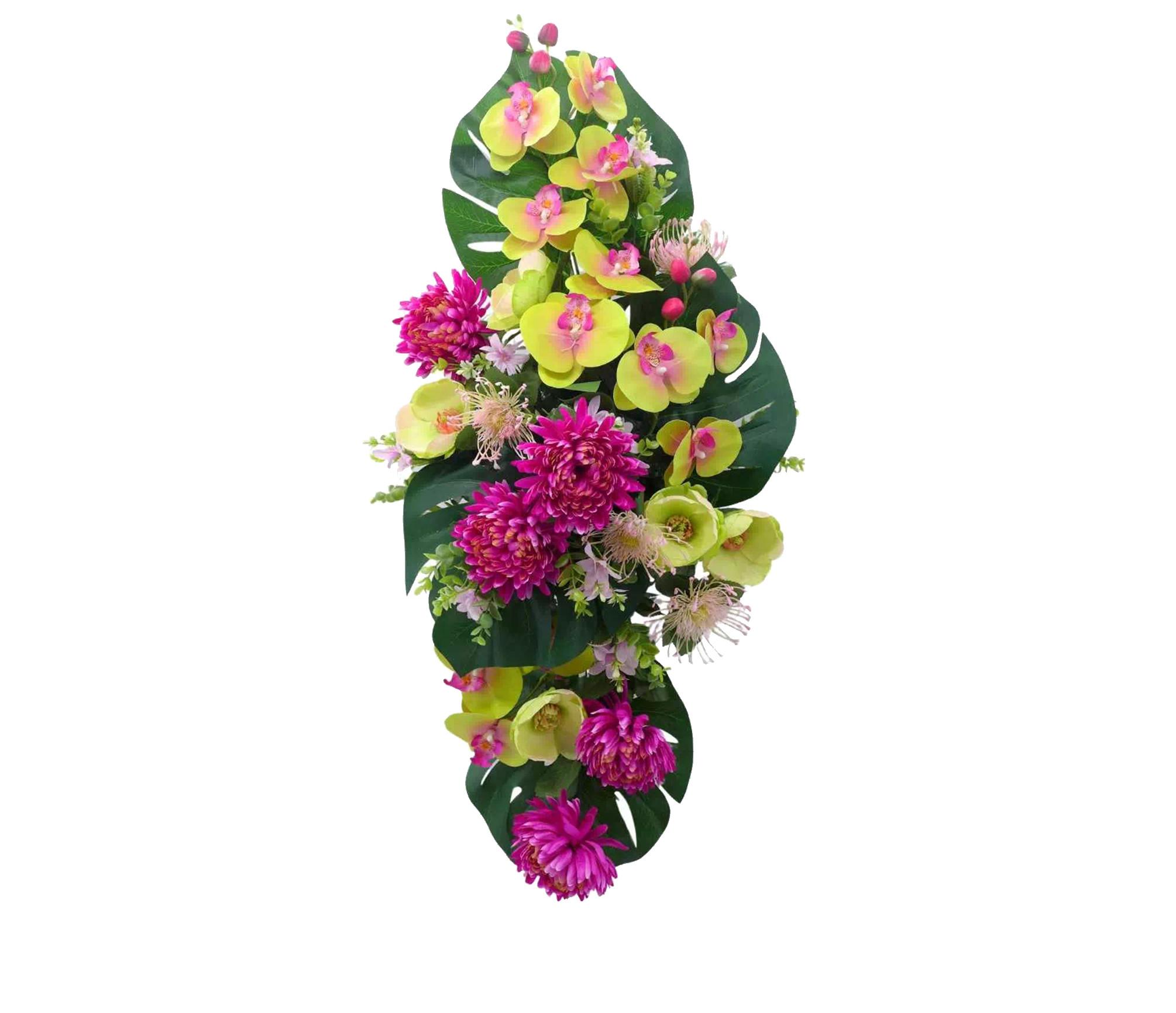 Quand les orchidées élégantes s’associent aux dahlias volumineux… La « Raquette funéraire lavande » donne une composition florale harmonieuse, travaillée dans la longueur. Les teintes de rose poudré et plus marqué, de vert tendre et foncé s’accordent ici subtilement afin d’accompagner le geste d’hommage d’une note apaisante.