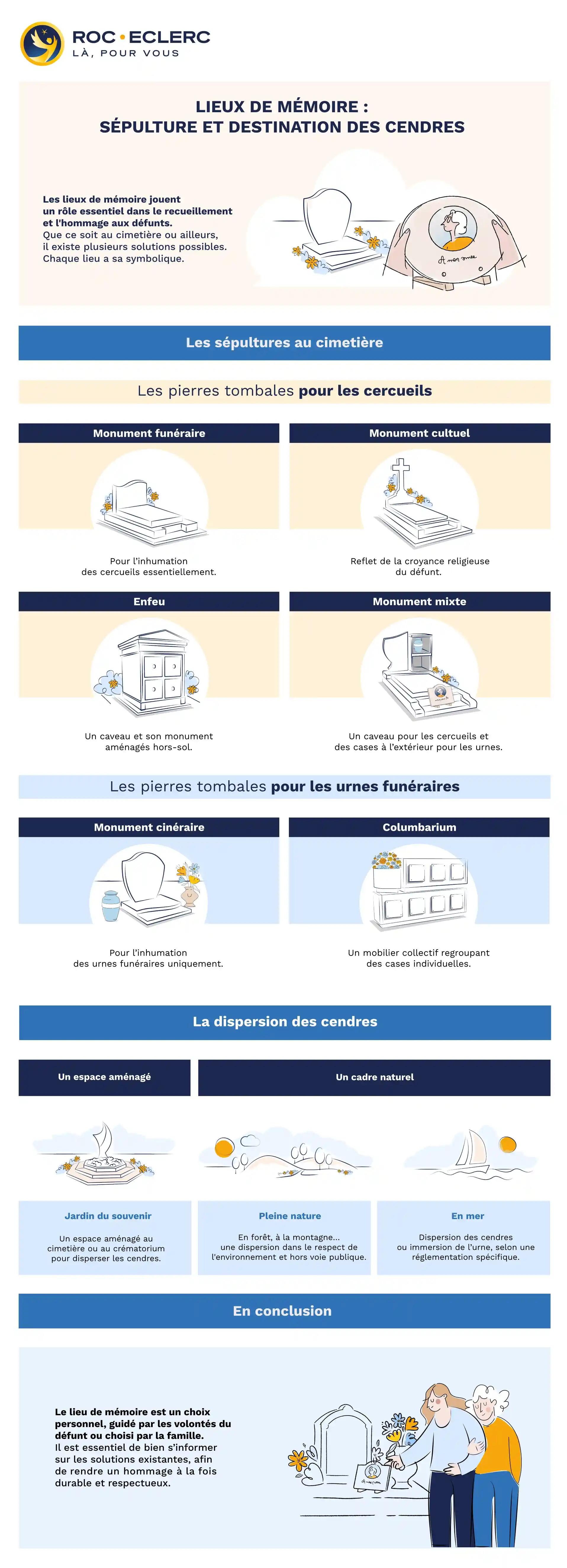 Lors de votre rendez-vous en agence, votre conseiller Roc Eclerc vous apporte toutes les informations utiles et pertinentes. Dans le cas d'une crémation, il vous explique alors les possibilités pour la destination des cendres, à savoir la conservation de l'urne funéraire (inhumée au sein d’une sépulture, scellée sur un monument funéraire ou déposée dans une case de columbarium) ou la dispersion des cendres.